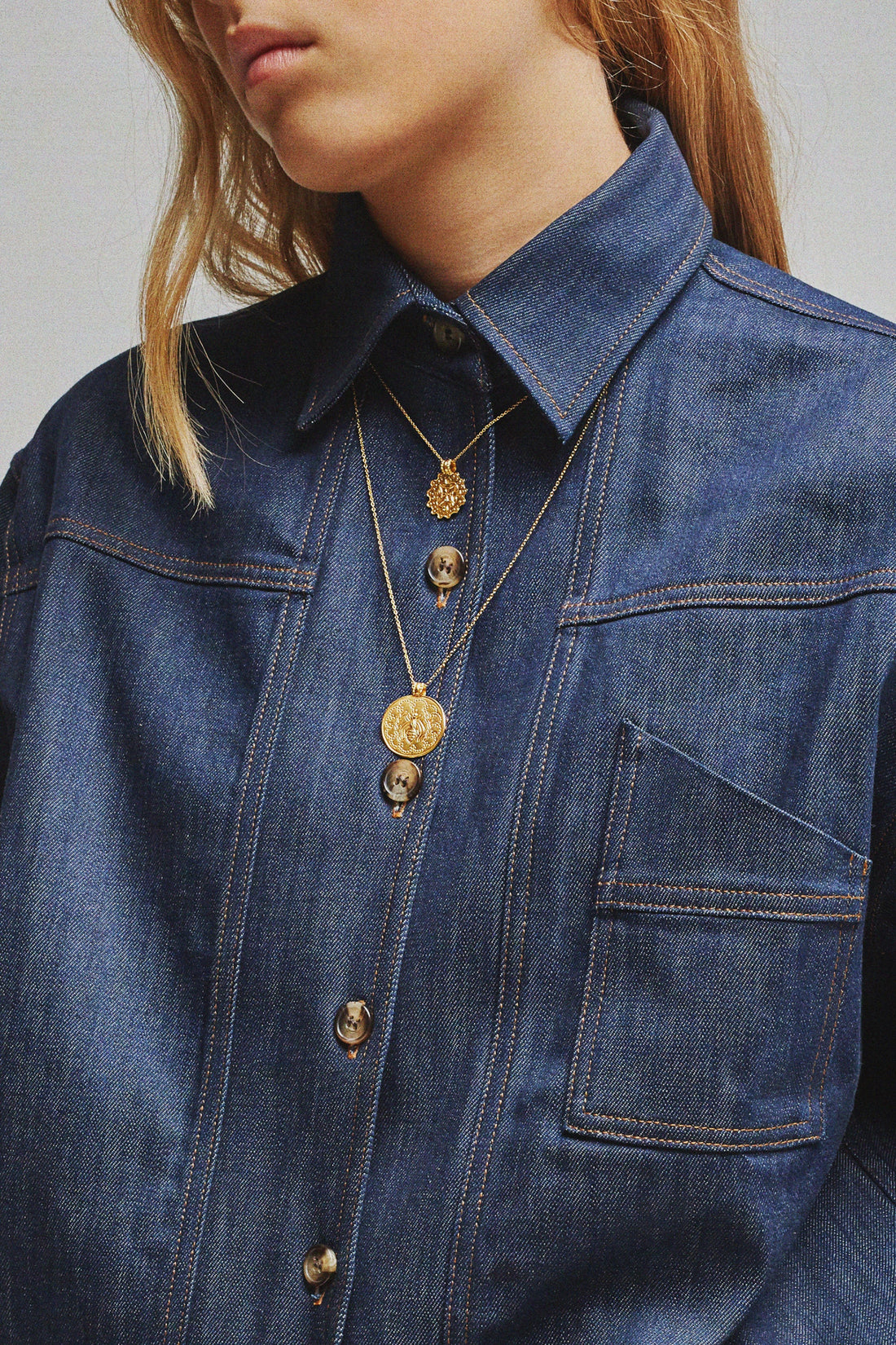 DOMITILLE 3 is a round vermeil pendant decorated with a bee. The motifs inside the medal are engraved by hammering.