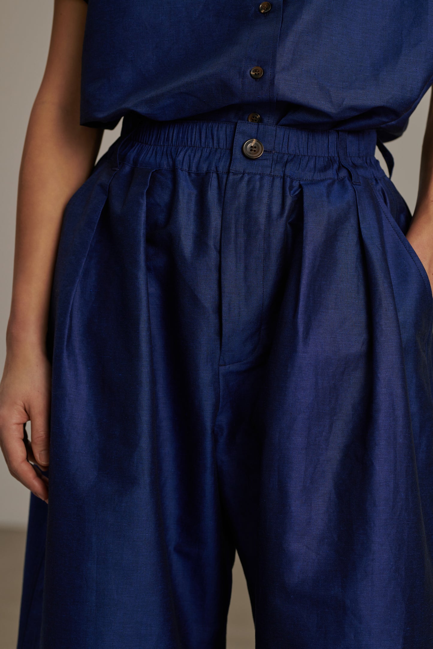 CAMERON is a wide-legged trouser with a rounded leg. Its fabric is a cotton-linen chintz, an elegant material with a slight sheen.